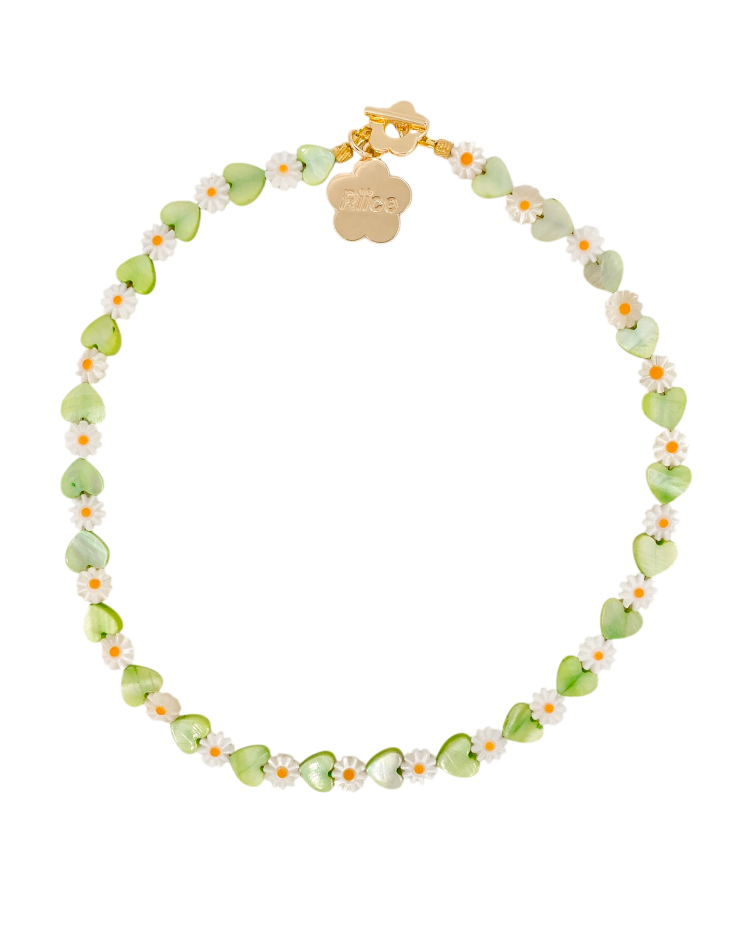 Natural shell beads, plated charm, and closure.