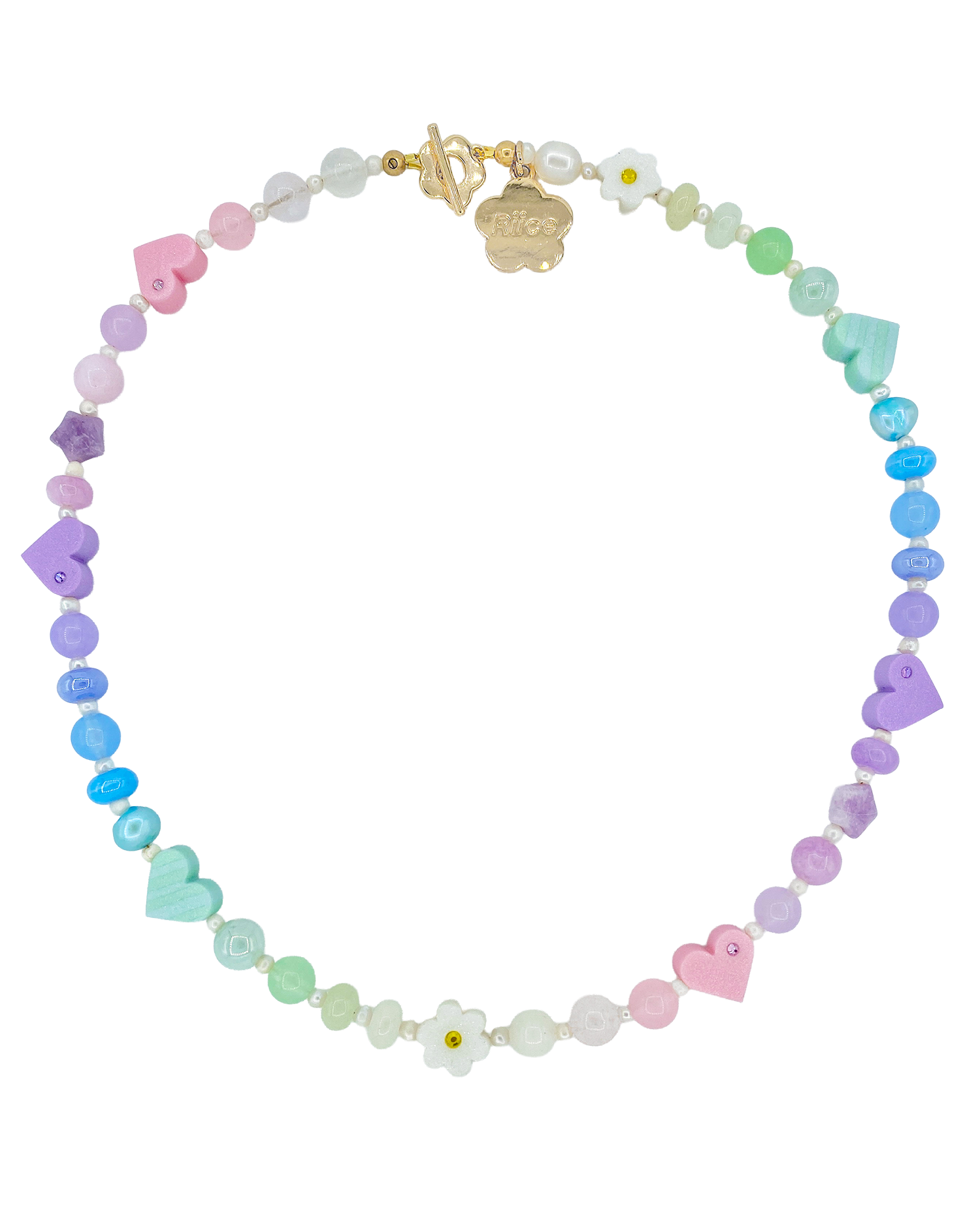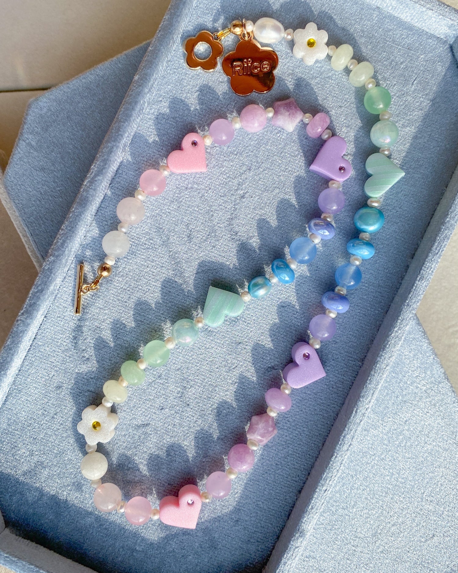 Freshwater pearls, gemstone, glass, handmade heart and flower beads, plated flower charm, and closure.