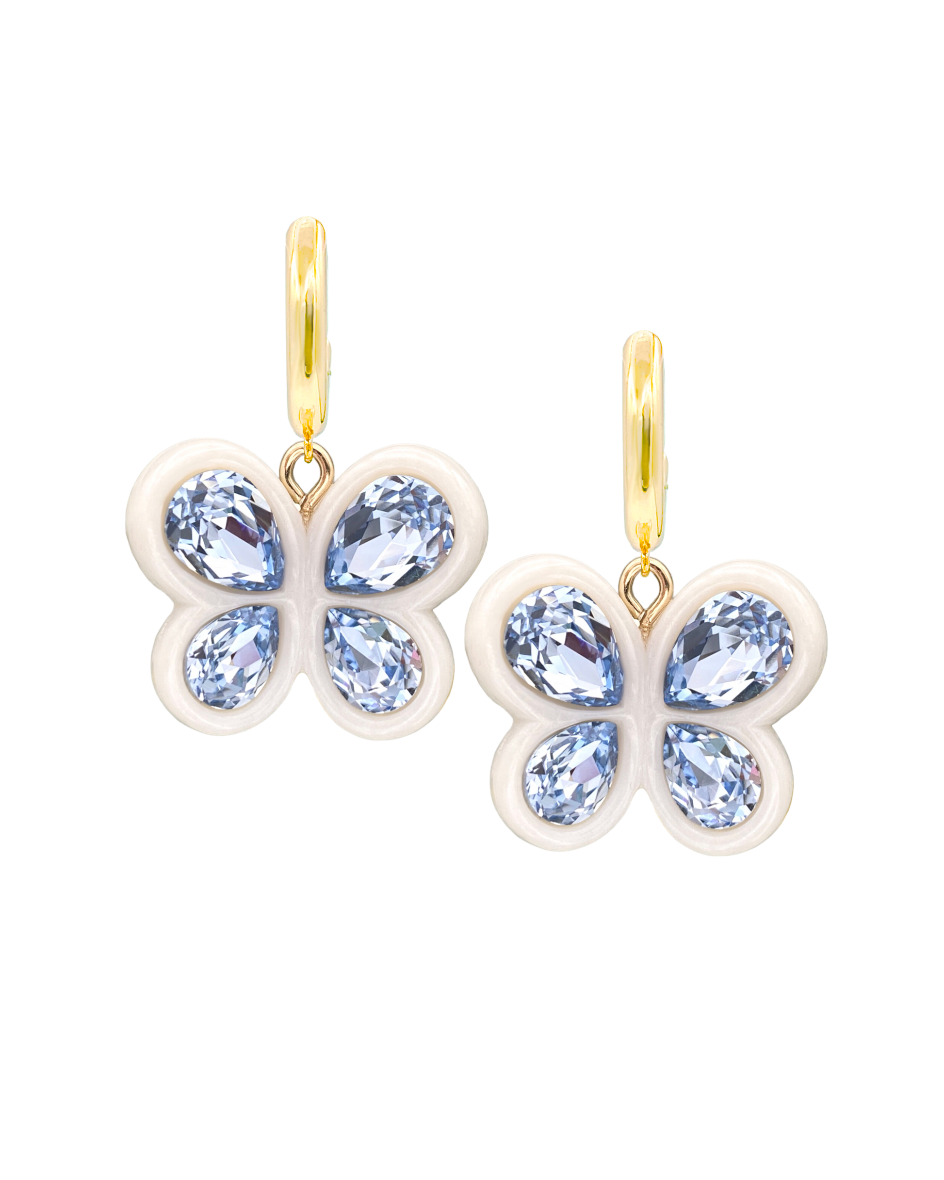 The pearlescent Papillon earrings feature sparkly soft blue crystals.