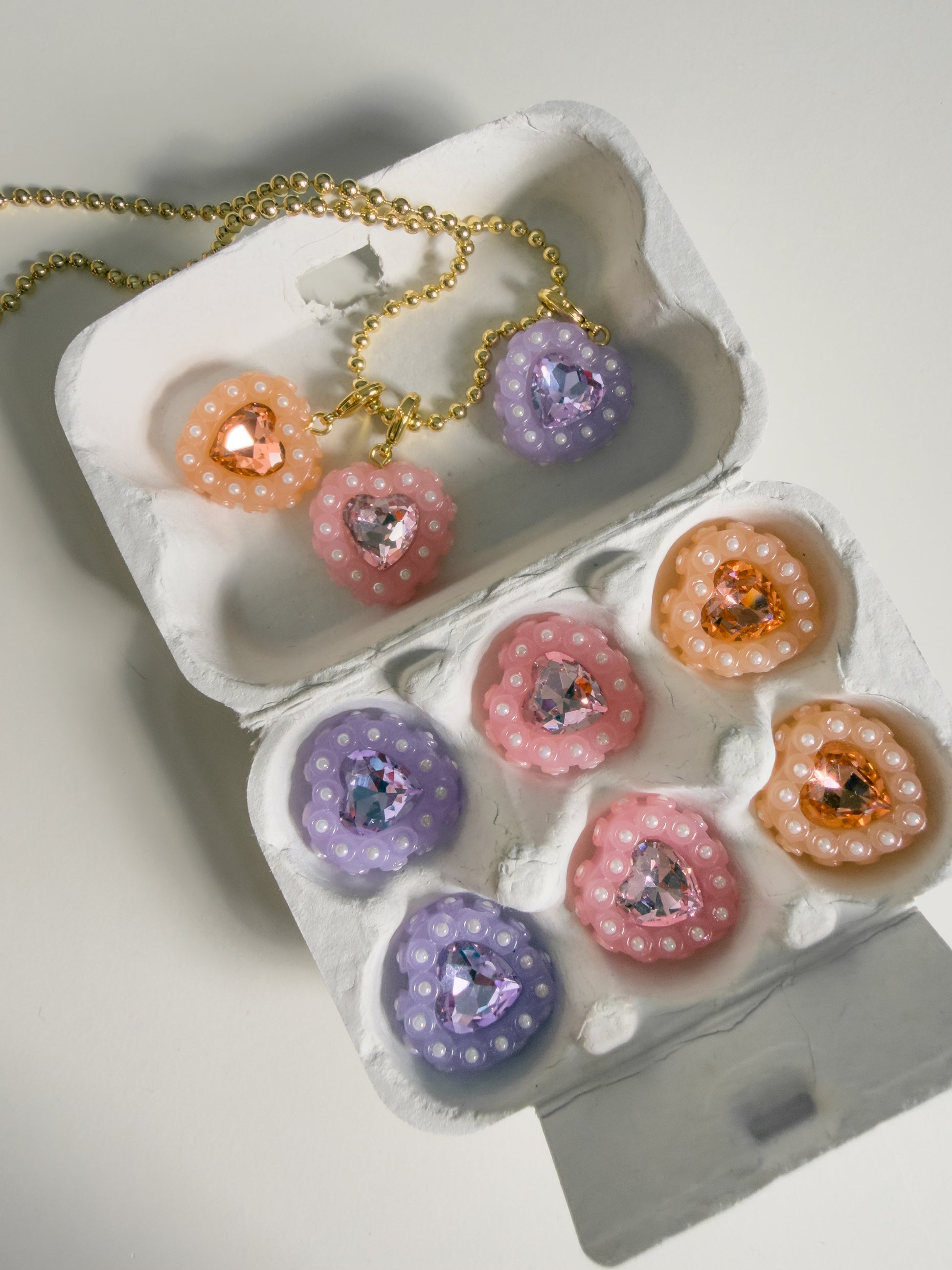 Treat yourself to a creamy, delicious sweet treat with a pair of Parfait earrings: an indulgent set of lilac hearts topped with little pearls all around.