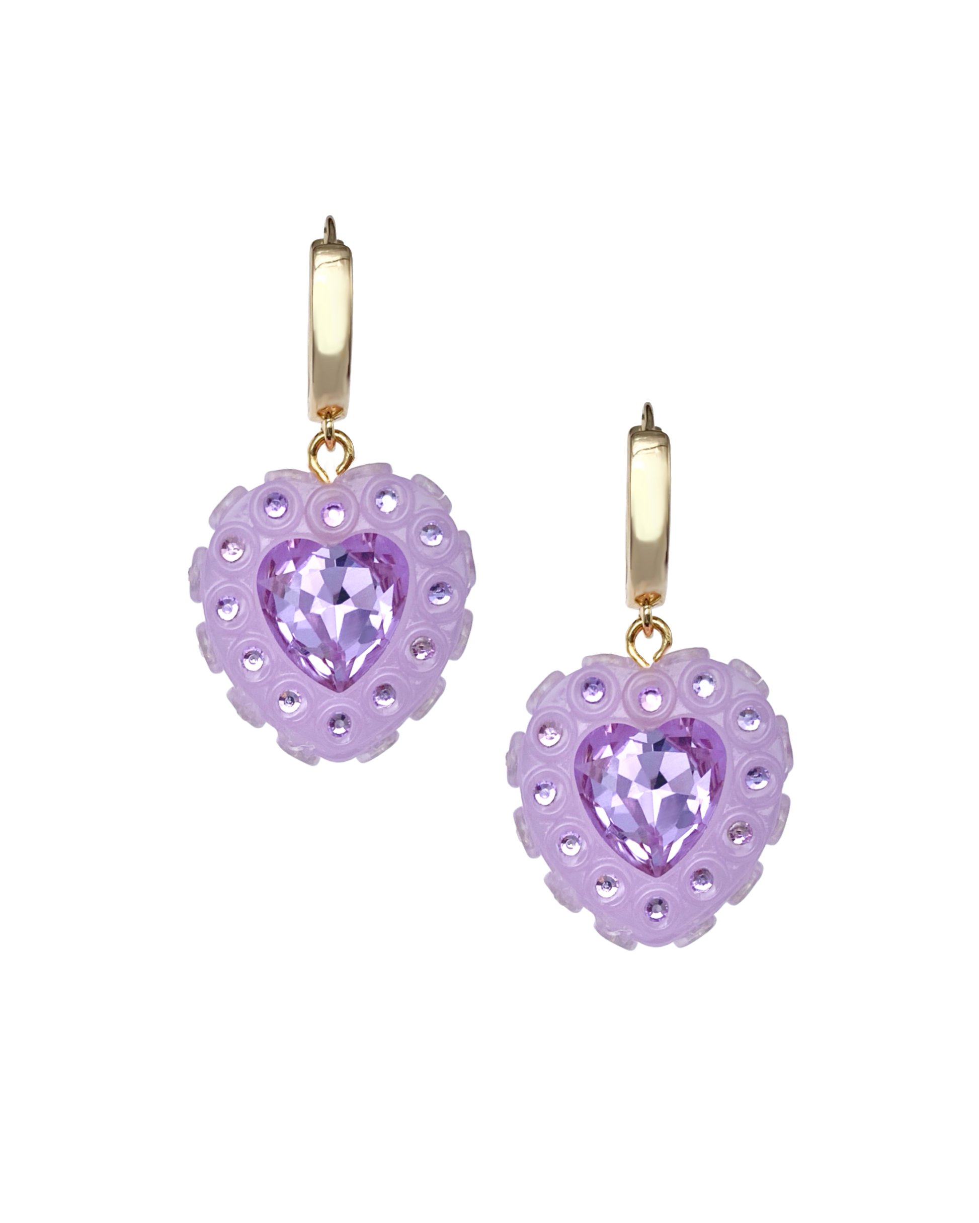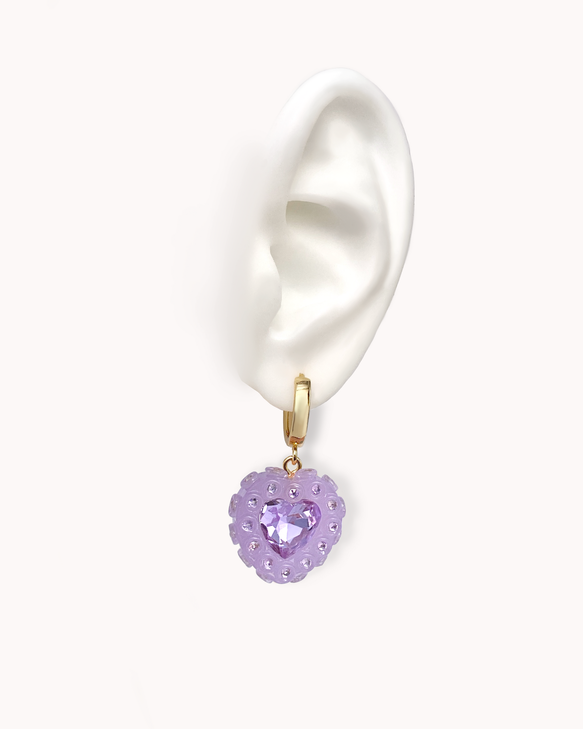 The vesper hoops hit with juicy, jelly lilac gloss and soft purple crystals that glow quietly with every move. Minimal, cute, and effortless.