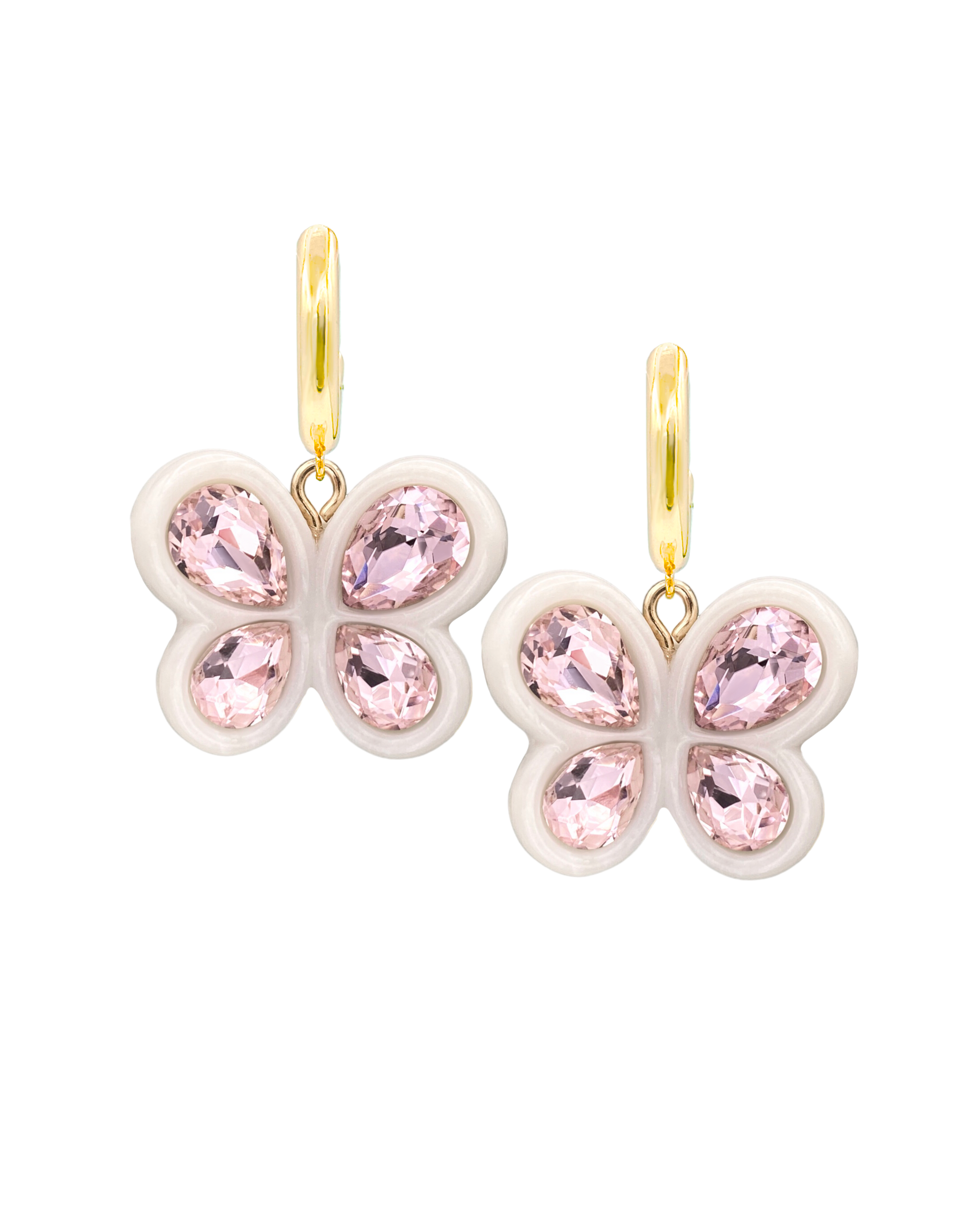 The pearlescent Vlinder earrings feature sparkly soft pink crystals.
